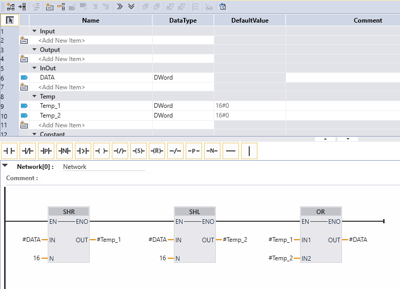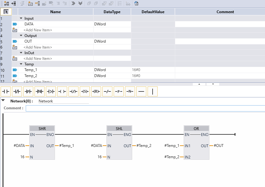 یک فانکشن به نام SWAP_DW (Swap DWORD) نوشتم که داخل این فانکشن عدد ورودی 16 بیت به چپ و 16 بیت به راست شیفت داده می شود و سپس مقادیر حاصل از شیفت ورودی با هم OR شده و در خروجی قرار میگیرند. در این حالت مقدار تگ ورودی پس از اجرای فانکشن ثابت می ماند و نتیجه در یک تگ جدید قرار میگیرد.