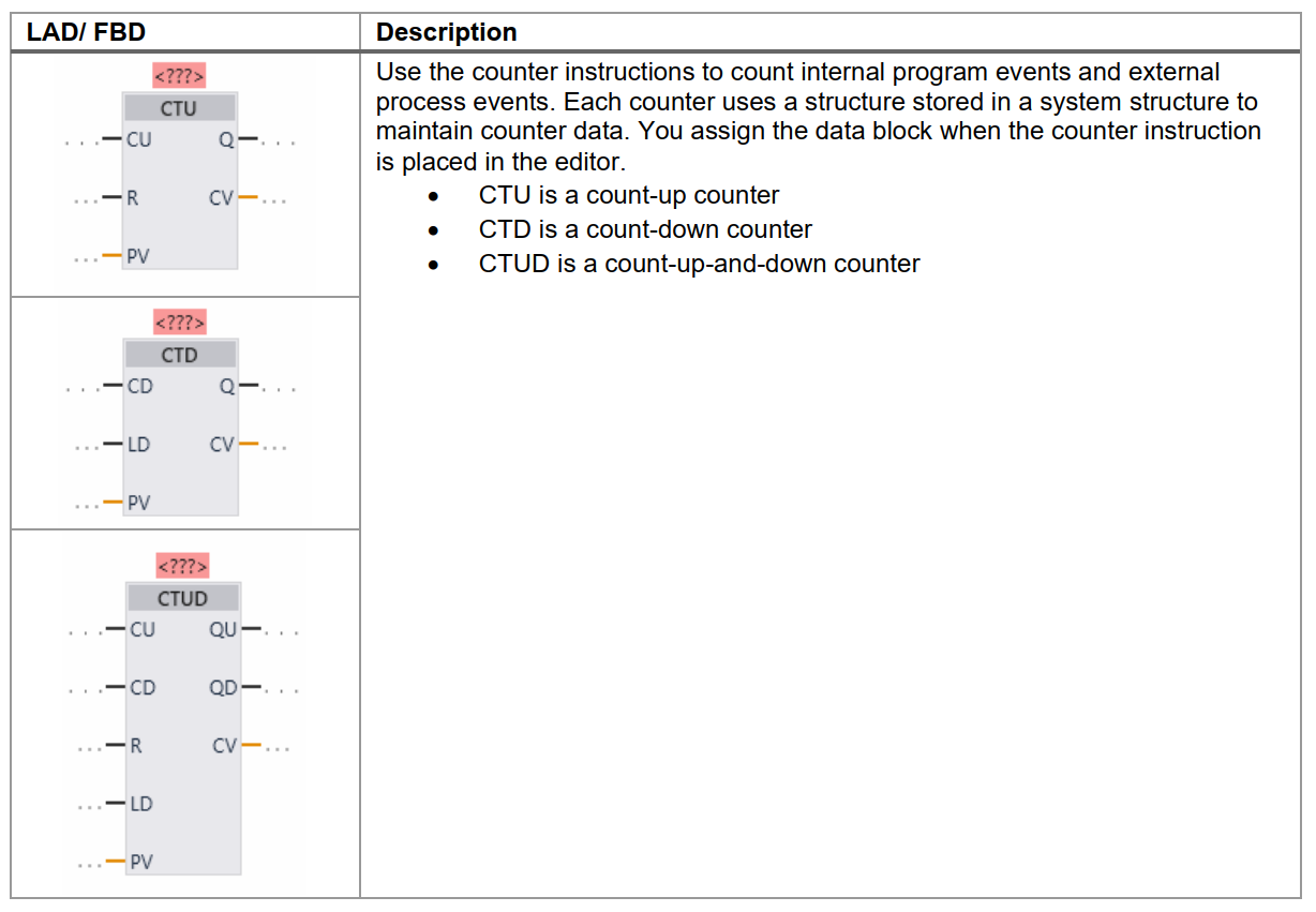 اینستراکشن های counter به طور کلی به سه دسته CTU (شمارنده بالارونده) ، CTD (شمارنده پایین رونده) و CTUD (شمارنده بالارونده و پایین رونده) دسته بندی می شوند.