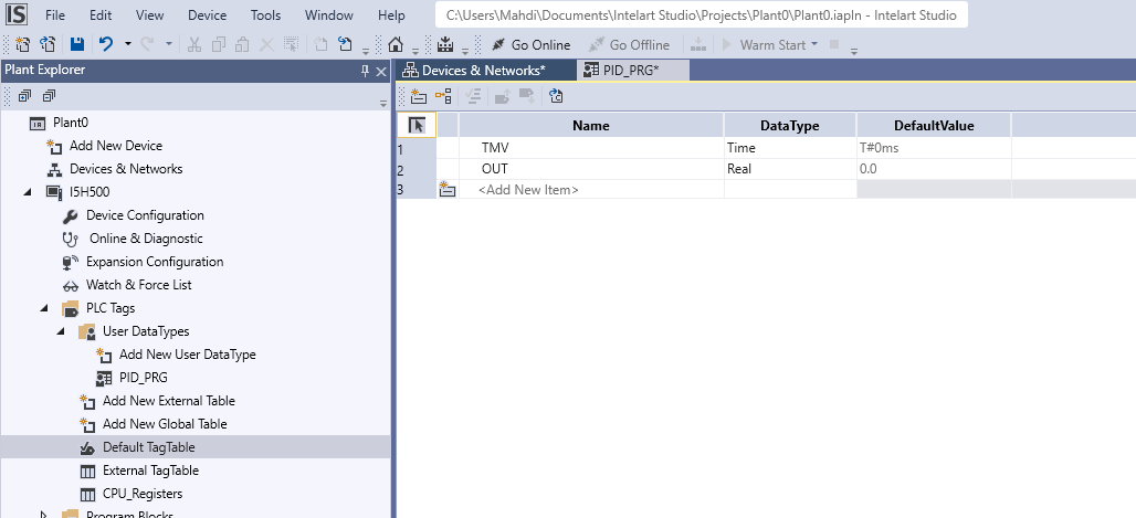 1- ابتدا باید یک User Data Type (UDT) یا همان استراکچر (Structure) بسازید که داخل این UDT باید یک تگ از جنس REAL و یک تگ از جنس TIME قرار داشته باشد. نام UDT اهمیتی نداره که چی باشه اما حتما یک REAL و یک TIME باید داخلش وجود داشته باشه. علاوه بر این دو شما میتوانید تگ های دیگری برای کاربرد های دیگر به تایپ جدید اضافه کنید. اسامی REAL و TIME باید به ترتیب OUT و TMV باشه. دلیلش این هست که RMP_GEN برای عملکرد خودش این دو تگ را نیاز داره و با این نام ها اون تگ ها را سرچ میکنه. مطابق تصویر زیر من یک یوزر تایپ ساختم و نام PID_PRG را برای این یوزر تایپ انتخاب کردم. به تگ های ساخته شده داخل این یوزر تایپ دقت کنید. پس از طراحی یوزر تایپ باید از تولبار بالای ادیتور دکمه Update Interface را بزنید تا دیتا تایپ جدید ساخته شده به عنوان تایپ های قابل استفاده در محیط برنامه ثبت بشه.