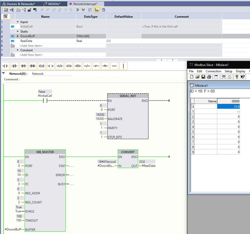 طبق تصویر زیر وقتی شما R/W32 رو روی مقدار True قرار بدید، اینستراکشن MB_MASTER به جای 16 بیت، 32 بیت دیتا را از Slave برداشت میکنه. دقت کنید که نوع بافر رو باید مناسب با نوع خواندن تنظیم کنید. مثلا وقتی قصد دارید به صورت 32 بیتی دیتا برداشت کنید (R/W32=True) باید بافر رو یک آرایه از DWORD تعریف کنید. DWORD همان Double Word هست که سایزش 32 بیت میشه.
