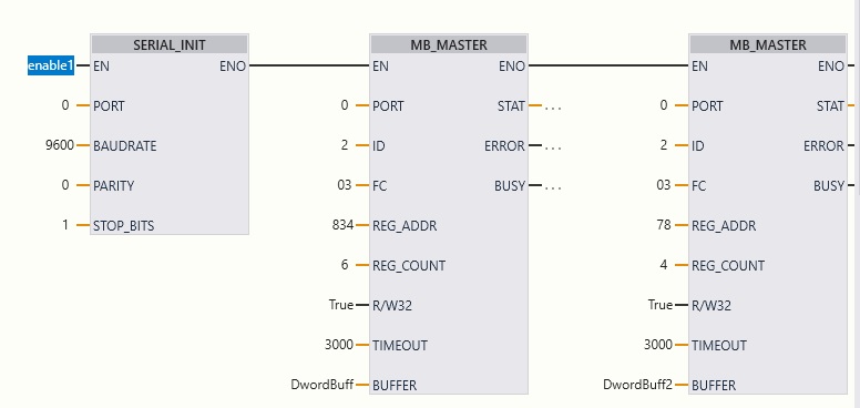 1- اینستراکشن SERIAL_INIT فقط یکبار اجرا شود و نیازی نیست هربار قبل از اجرای MB_MASTER آن را اجرا کنید مگر اینکه نیاز باشد پارامترهای پورت سریال تغییر دهید