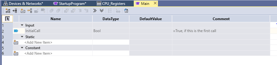 برخی از Organization Blockها که به صورت دائمی اجرا میشوند مانند CyclicProgram، PeriodicInterrupt، EmergencyStopProgram و TimeOfDayInterrupt در لیست تگ های لوکال خوشان یک تگ به نام InitialCall دارند. مقدار این این تگ در اولین سیکل اجرای آن True خواهد بود و پس از آن همیشه مقدار False را خواهد داشت.