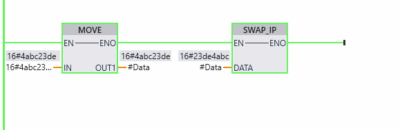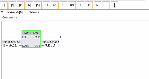 یک فانکشن به نام SWAP_DW (Swap DWORD) نوشتم که داخل این فانکشن عدد ورودی 16 بیت به چپ و 16 بیت به راست شیفت داده می شود و سپس مقادیر حاصل از شیفت ورودی با هم OR شده و در خروجی قرار میگیرند. در این حالت مقدار تگ ورودی پس از اجرای فانکشن ثابت می ماند و نتیجه در یک تگ جدید قرار میگیرد.